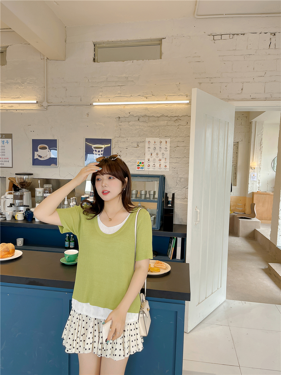 大码女装假两件v领t恤女2021夏季新款胖mm设计感显瘦针织衫